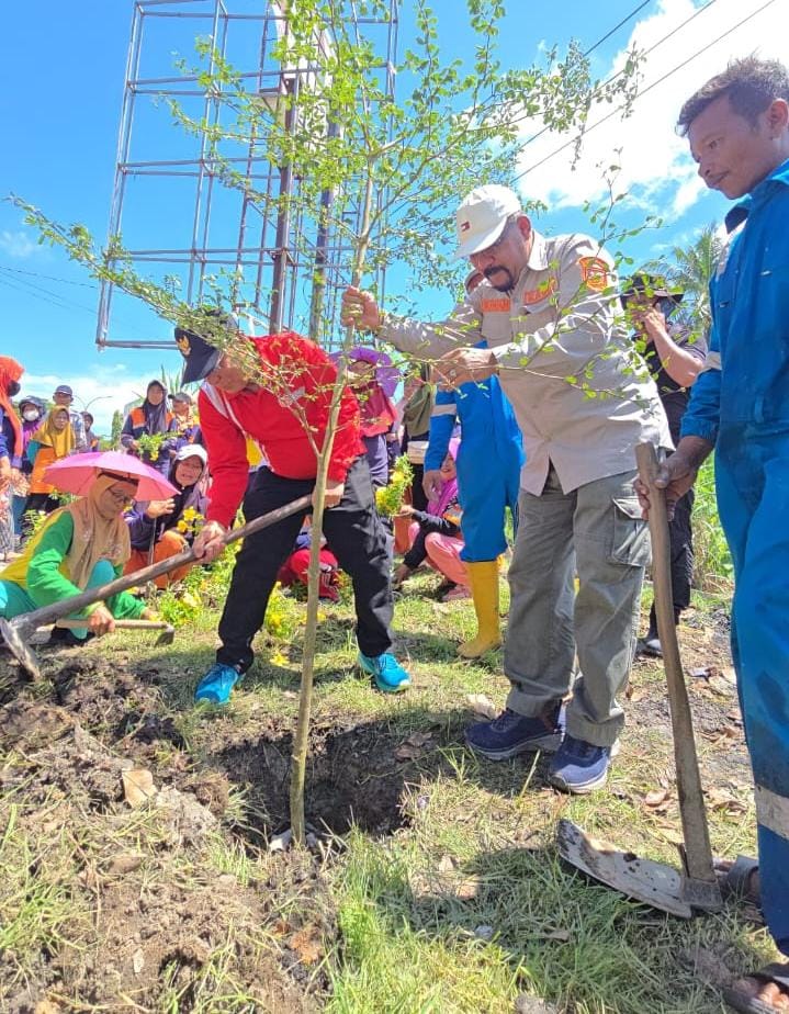 ” Hari ini kami bersama pak Bupati melakukan gotong royong bersama dengan agenda Penanaman pohon Ketapang sebanyak 100 batang, menanam bunga Alamanda/trompet kuning, serta pembersihan parit dan pemotongan rumput. adapun kegiatan ini dalam rangka gotong royong bersama petugas kebersihan dan Taman Batu 7,” Jelas Suwandi.
