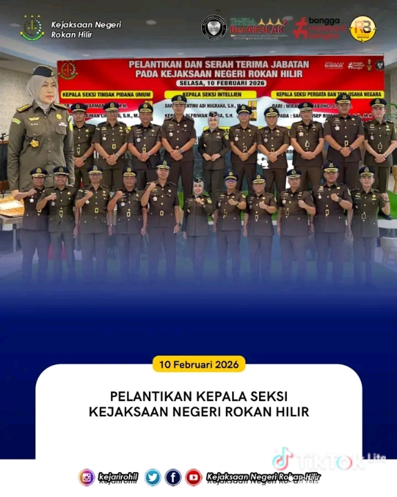 Pekanbaru,Zadanews.com – Plt. Kepala Kejaksaan Negeri Rokan Hilir Ibu Dwi Astuti Beniyati, S.H., M.H. melaksanakan kegiatan pelantikan Kepala Seksi di lingkungan Kejaksaan Negeri Rokan Hilir yang bertempat di Kejaksaan Tinggi Riau, pada hari Selasa, (10/02/2026). Pelantikan ini merupakan bagian dari upaya penyegaran organisasi serta penguatan kinerja institusi dalam rangka optimalisasi pelaksanaan tugas dan fungsi Kejaksaan Negeri Rokan Hilir. Adapun pejabat yang dilantik yaitu: 1. Maiman Limbong, S.H., M.H. sebagai Kepala Seksi Tindak Pidana Umum, menggantikan Lita Warman, S.H., M.H. 2. Wisnu Ngudi Wibowo, S.H., M.H. sebagai Kepala Seksi Tindak Pidana…