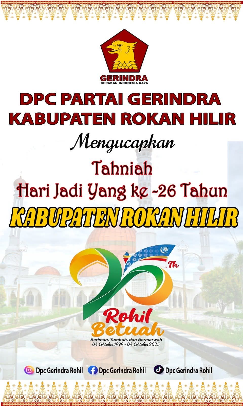 Rohil,Zadanews.com — 03 Oktober 2025 DPC Partai Gerindra Rohil mengucapkan selamat hari jadi yang ke-26 tahun Kabupaten Rokan Hilir. Dengan mengusung tema “Rohil Bertuah Beriman Tumbuh dan Bermawah”.